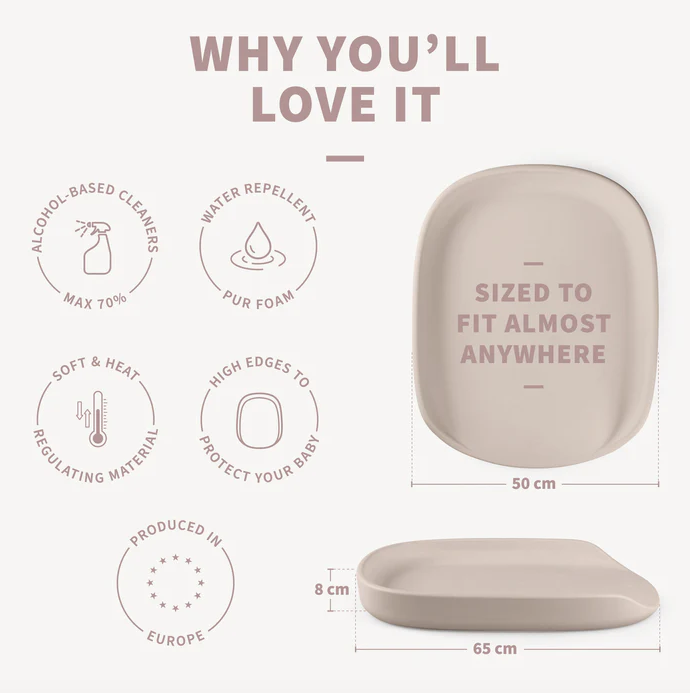 Il fasciatoio Sebra PUSLE PUR ha una superficie morbida e idrorepellente facile da pulire. La forma a nido del bambino con un bordo alto aiuterà a evitare che il bambino rotoli giù dal materassino. I bordi morbidi assicurano inoltre che il bambino attivo che si muove durante il cambio del pannolino non sbatta la testa contro la parete posteriore o il bordo del fasciatoio.