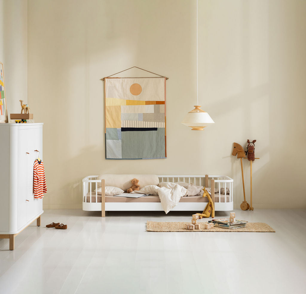 Il letto fa parte della serie di letti Wood Original. È dotato di gambe in splendido rovere massello oliato bianco e può essere facilmente convertito in altri letti della serie per adattarsi alle mutevoli esigenze del bambino.